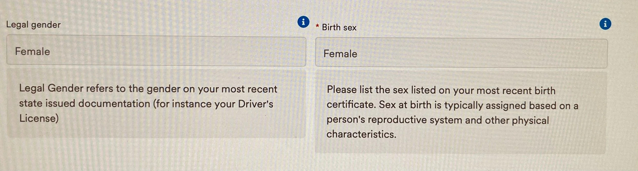 For “birth sex” it says “…the sex listed on your most recent birth certificate. Sex at birth is typically assigned based on a person’s reproductive system and other physical characteristics.”